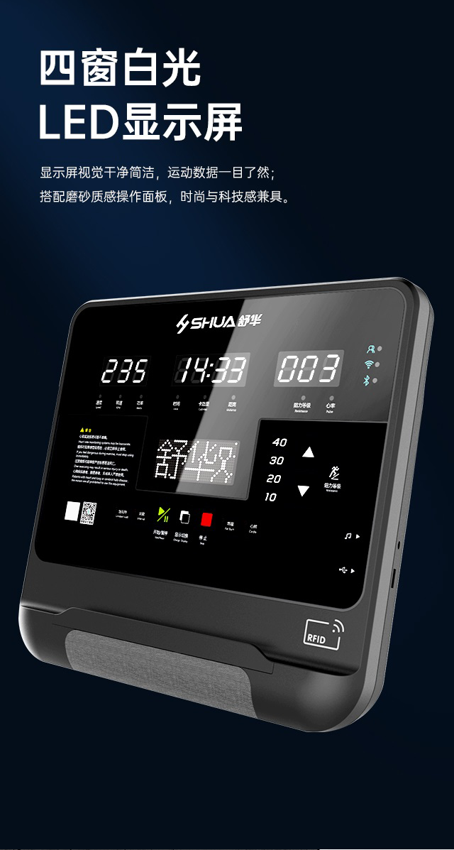 舒華高端跑步機(jī)SH-T9100T(V10+)擁有超大高清32寸10點(diǎn)觸控晶屏的工業(yè)屏,具有掃碼、刷卡、人臉識(shí)別等多種智能登錄方式,方便快捷,并且有在線教學(xué)、專業(yè)健身模式隨意切換,讓您開(kāi)啟科學(xué)健身。
