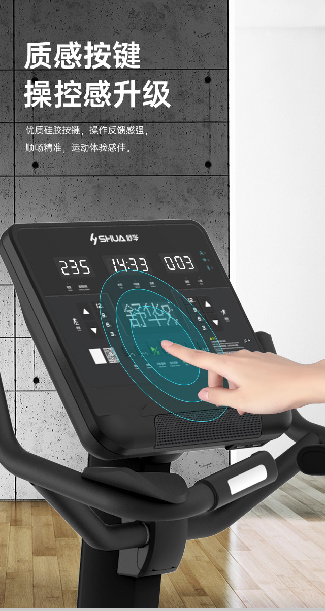 舒華立式商用健身車SH-B9100U(V10)觸屏版擁有超大顯示和操作屏幕, 可以任意設(shè)置阻力、時(shí)間和距離等參數(shù),還可以即時(shí)顯示心跳和轉(zhuǎn)速等數(shù)據(jù),同時(shí),SH-B9100U提供多項(xiàng)科學(xué)運(yùn)動(dòng)處方,更輕松掌握運(yùn)動(dòng)節(jié)奏。