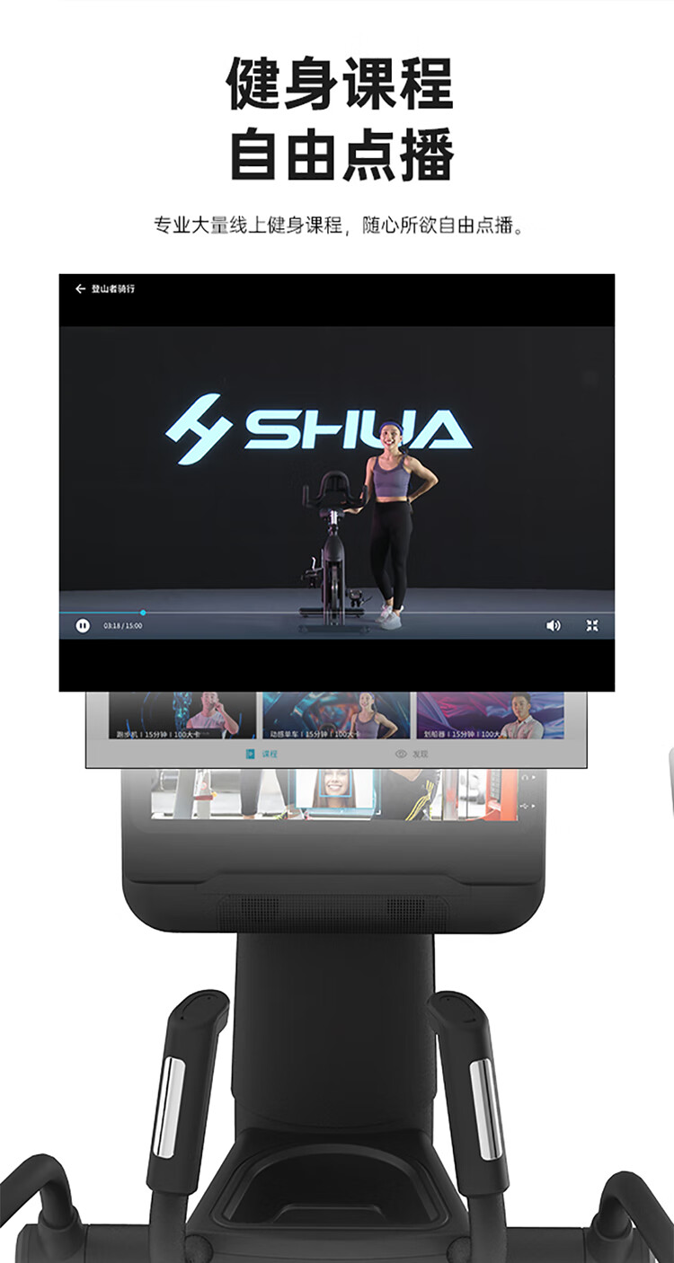 舒華立式商用健身車SH-B9100U(V10)觸屏版擁有超大顯示和操作屏幕, 可以任意設(shè)置阻力、時(shí)間和距離等參數(shù),還可以即時(shí)顯示心跳和轉(zhuǎn)速等數(shù)據(jù),同時(shí),SH-B9100U提供多項(xiàng)科學(xué)運(yùn)動(dòng)處方,更輕松掌握運(yùn)動(dòng)節(jié)奏。