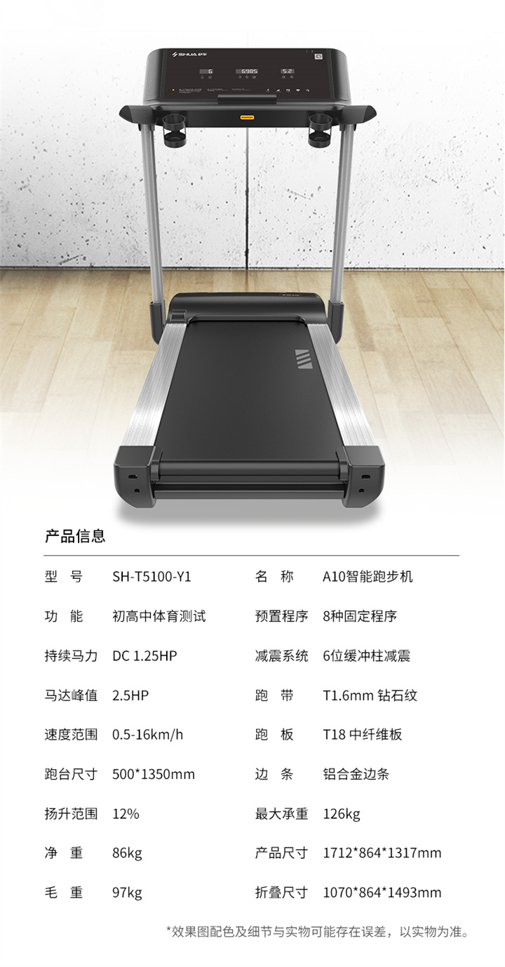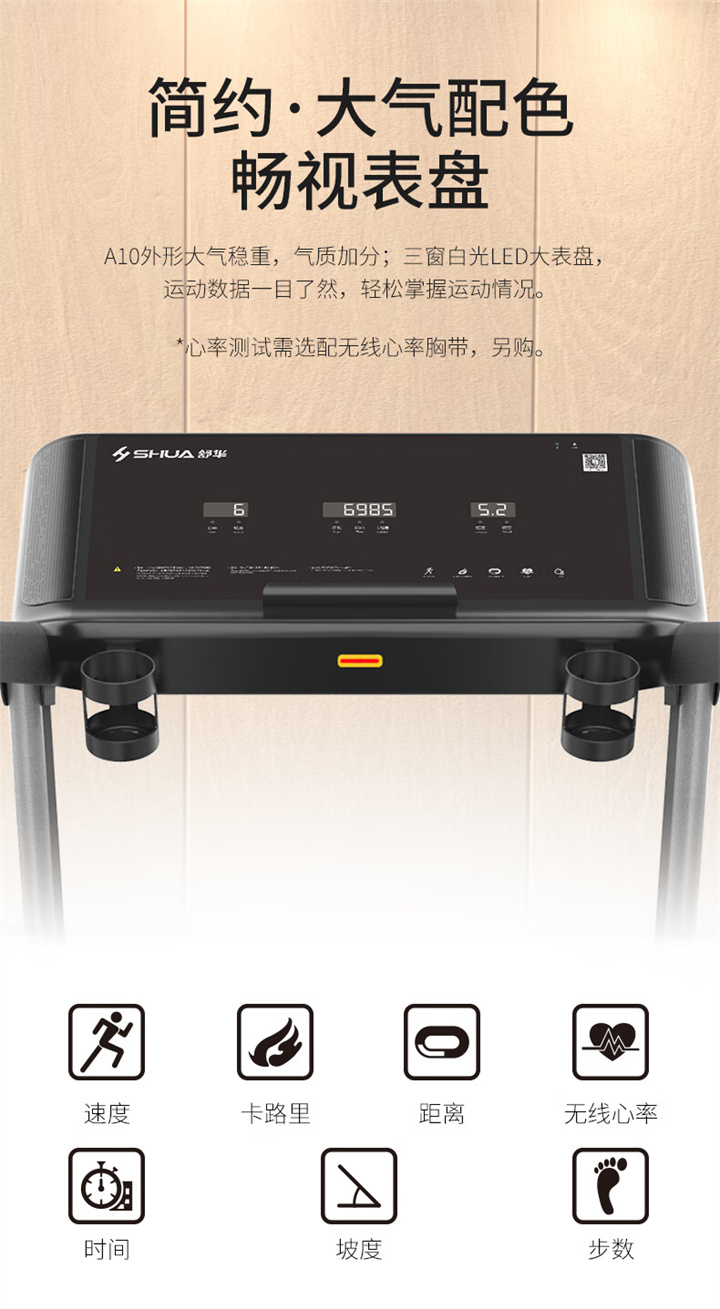 舒華家用跑步機(jī)SH-T5100持續(xù)馬力達(dá)1.25HP,具有500×1350mm的跑臺,運用無線心率接收模塊監(jiān)測心率,運用6位硅膠減震設(shè)計,最大承重是126kg,可以滿足大多數(shù)家庭的使用。
